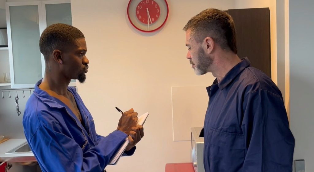 El fregadero de la cocina está atascado y gotea por debajo, dos fontaneros vienen a reparar la fuga de agua. ¿Qué hacer? Lo mejor es comprobar sus respectivas herramientas personales. Cada uno mira al otro, miradas furtivas, se miran el culo y es entonces cuando unen lo útil con lo agradable. Bombean, lamen y follan cerca de la cocina para terminar con una bonita eyaculación.